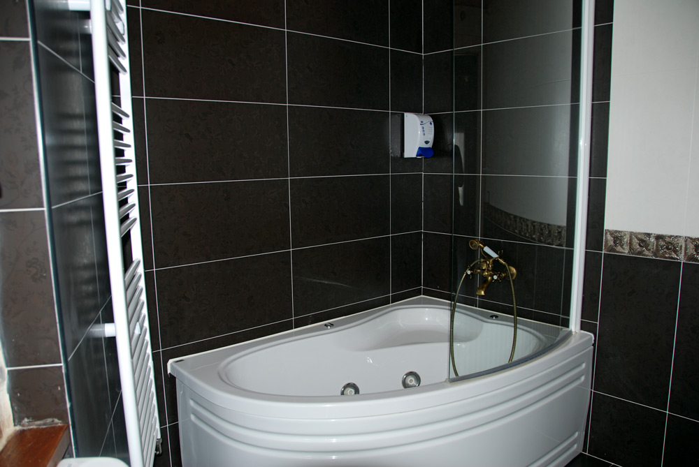 Habitación doble con cama de matrimonio, sala de estar, cocina y baño con bañera de hidromasaje individual.