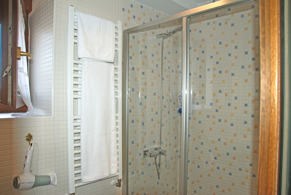 Habitación doble con cama de matrimonio y ducha.